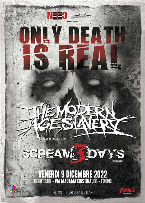I THE MODERN AGE SLAVERY, una delle band death metal più incredibili emerse dalla scena tricolore, in cinque lustri hanno pubblicato tre brutali album in studio e hanno diviso il palco in tutta Europa con Cannibal Corpse, Dying Fetus, Obscura, Malevolent Creation, Vomitory, Fleshgod Apocalypse, Sepultura, Decapitated, Suicide Silence, Gorgoroth, Vital Remains, Hypocrisy, Jinjer, Decapitated, Incite, Slipknot, Sabaton, Behemoth e molti altri.