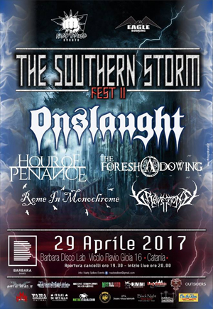 Meno di un mese al The Southern Storm Fest II, il metal fest che si terrà a Catania il prossimo 29 Aprile e che avrà l’onore di ospitare come headliner gli storici thrasher inglesi Onslaught. Ad aprire la serata il death prog dei romani Gravestone, cui seguiranno i doomster Rome in Monochrome e, sempre dalla Capitale, altre due band d’indubbio prestigio: i The Foreshadowing con il loro gothic doom e i deathster Hour of Penance. Un bill che spazia quindi in diversi ambiti del metal estremo per offrire al pubblico un’indimenticabile notte di musica!