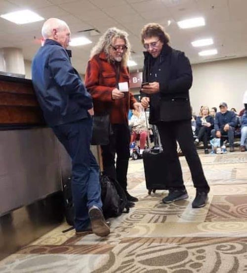 L’ha scattata Joe Siegler di Black Sabbath Online e riprende Robert Plant, al centro e con giubbino rosso, storico cantante degli altrettanto storici Led Zeppelin, e Tony Iommi, a destra dei tre in foto, storico chitarrista degli altrettanto storici Black Sabbath. I due sono all’aeroporto di Nashville, negli USA. Sembrano essersi incontrati per caso e Iommi mostra qualcosa sul proprio telefono a Robert. I due sono in attesa di un aereo, lo stesso o forse no, chissà ma debbono di certo imbarcarsi. Basta guardare la gente seduta sullo sfondo in attesa della chiamata per l’imbarco, per capire che i due aspettano la stessa cosa.