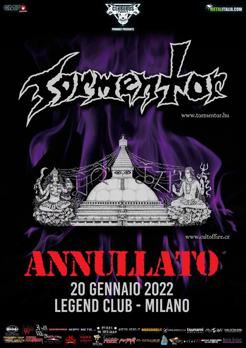Secondo quanto dichiarato dalle band, a causa delle restrizioni e normative che regolano la musica dal vivo in materia di Covid-19 all’interno della comunità europea, il tour di TORMENTOR e CULT OF FIRE, compresa la data prevista per il 20 Gennaio al Legend Club di Milano, è da considerarsi annullato.
