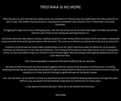 Le parle della band: “I Tristania non ci sono più. Dopo 26 sulla scena metal internazionale i membri dei Tristania questa settimana hanno preso la dura decisione finirla qui. Questo significa che ogni piano futuro, compreso il tour sud americano di dicembre, è stato cancellato. Alle prese con anni davvero difficili, come per il resto del mondo, siamo stati ansiosi di guardare finalmente in avanti, con il tour in America Latina che doveva essere il nostro prossimo grande passo. Ma la scorsa settimana è arrivata la notizia di una grave situazione medica in una famiglia vicina all’interno della band. È stato un colpo per noi, e ci dispiace molto condividere la cosa. I Tristania sono una band che non è mai scesa a compromessi per quanto riguarda la nostra arte, e non c’è mai stata l’opzione di offrire qualcosa che non sia al 100% per i nostri fans e seguaci. La tempistica di questi eventi non poteva essere peggiore, e per noi è molto triste non essere in grado di incontrare nuovamente i nostri amici in America Latina. Abbiamo sempre avuto una relazione speciale con i fans di quelle terre. Ci scusiamo con chiunque venga condizionato dalla nostra decisione. Vogliamo ringraziare tutti quelli con i quali abbiamo lavorato assieme per quasi tre decenni di comporre di musica, registrazioni, pubblicazioni e tour… e vogliamo abbracciare e ringraziare particolarmente quelli della Continental Concerts i quali sono stati al nostro fianco nel bene e nel male per un periodo significativo della carriera della band. Infine vogliamo ringraziare i nostri fans fedeli in tutto il mondo, per la favolosa esperienza di tutti questi anni. Senza di voi non avremmo mai avuto l’ispirazione di continuare fino ad ora. Sono stati 26 anni favolosi. Ora allietiamoci con tutti i ricordi.”