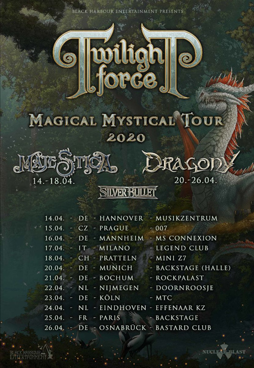 Gli avventurosi metaller svedesi TWILIGHT FORCE sono felici di annunciare il loro primo tour da headliner di sempre! Appropriatamente chiamato “Magical Mystical Tour 2020” avrà luogo ad aprile con gli ospiti speciali MAJESTICA e DRAGONY, oltre a SILVER BULLET di supporto. Presenteranno i fantastici racconti del nuovo album “Dawn Of The Dragonstar”, uscito ad agosto su Nuclear Blast (recensione qui).La band dichiara: “Cavalieri, maghi, viandanti e avventurieri dei Sette Regni! I TWILIGHT FORCE sono incommensurabilmente orgogliosi ed entusiasti di annunciare il loro primo tour da headliner in assoluto! Affronteremo un viaggio scintillante attraverso numerosi regni e reami e combatteremo non meno di dodici potenti battaglie magiche insieme a voi! Quindi, affilate le vostre spade, perfezionate i vostri incantesimi e unitevi a noi in questa ricerca basilare per il destino dei Regni del Crepuscolo! E la gloria non finisce qui, poiché i TWILIGHT FORCE saranno accompagnati da alleati eroici nelle loro avventure! Per la prima parte del tour, gli ospiti speciali non sono altro che i MAJESTICA! Tommy Johansson e i suoi cavalieri proporranno i loro meravigliosi inni di battaglia! A metà tour essi partiranno per altre missioni, quindi dalla battaglia di Monaco il 20 aprile e in quelle a seguire, ospiti speciali saranno i magnifici signori della ricerca DRAGONY ad aiutare i TWILIGHT FORCE a portare onore e giustizia nelle terre! Infine, il gruppo di apertura del tour nonché i cavalieri che dovranno coraggiosamente essere nella prima linea di difesa contro le forze dell’oscurità, sono i potenti guerrieri SILVER BULLET!”.