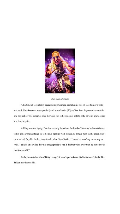 “Una vita di esibizioni leggendarie e aggressive ha avuto un impatto negativo sul corpo e sull’anima di Dee Snider. All’insaputa del pubblico (fino ad ora), Snider (70 anni) soffre di artrite degenerativa e nel corso degli anni ha subito diversi interventi chirurgici solo per poter continuare a esibirsi, riuscendo a cantare solo poche canzoni alla volta nonostante il dolore. A peggiorare le cose, Dee ha recentemente scoperto che l’intensità con cui si è dedicato al lavoro di una vita ha avuto ripercussioni anche sul suo cuore. Non può più spingersi oltre i limiti della furia rock ‘n’ roll come ha fatto per decenni. Snider afferma: ‘Non conosco altro modo di fare rock. L’idea di rallentare è inaccettabile per me. Preferisco andarmene piuttosto che essere l’ombra di me stesso’. Come diceva l’immortale Dirty Harry: ‘Un uomo deve conoscere i propri limiti’. Purtroppo, Dee Snider ora conosce i suoi.”