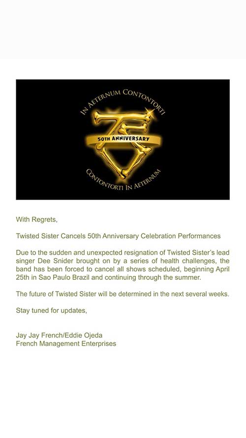 “Con rammarico, i Twisted Sister annullano i concerti per il 50° anniversario. A causa delle improvvise e inaspettate dimissioni del cantante Dee Snider, dovute a una serie di problemi di salute, la band è stata costretta ad annullare tutti i concerti in programma, a partire dal 25 aprile a San Paolo del Brasile e per tutta l’estate. Il futuro dei Twisted Sister sarà deciso nelle prossime settimane.