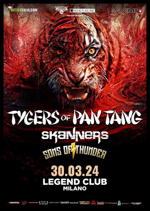 Si avvicina la data del 30 marzo 2024 che vedrà il ritorno dei TYGERS OF PAN TANG nel capoluogo meneghino. I signori della NWOBHM terranno uno spettacolo che ripercorrerà tutta la propria carriera, dai classici del passato ai brani dell’ultimo “Bloodlines”, edito da Mighty Music nel 2023. La band di Robb Weir e Jack Meille, inoltre, pubblicherà il prossimo 26 aprile il live album “Live Blood“.Con loro, troveremo un’altra band leggendaria: gli SKANNERS! Lo storico combo capittanato dal frontman Claudio “Klaus” Pisoni ha raggiunto di recente il ragguardevole traguardo dei 40 anni di carriera e ha pubblicato il singolo “Starlight MMXXIV”, una riedizione del celebre brano presente nell’album “Dirty Armada” del 1986.