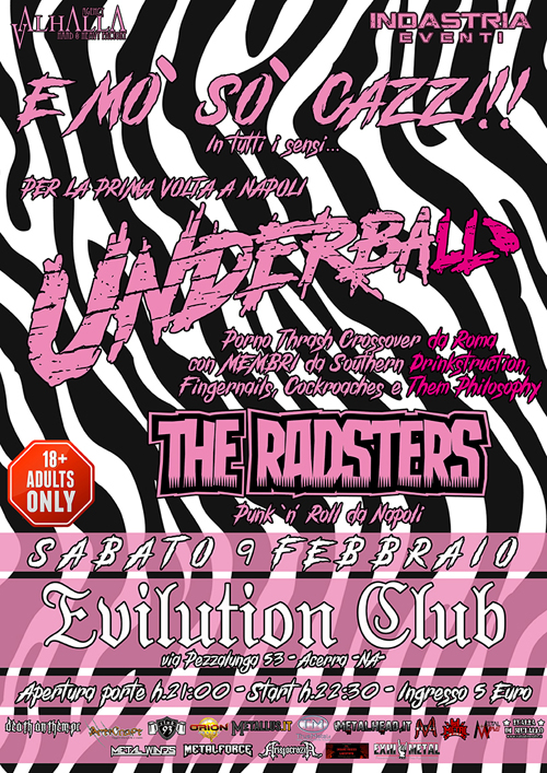 Sono i romani Underball, Thrash/Crossover band in cui militano tra gli altri membri di Fingernails e Southern Drinkstruction e che saranno gli headliner di una delle serata più attese della stagione di concerti dell’Evilution Club di Acerra (NA). Per gli amanti delle sonorità di Nuclear Assault, S.O.D. e Municipal Waste una serata assolutamente da non perdere!