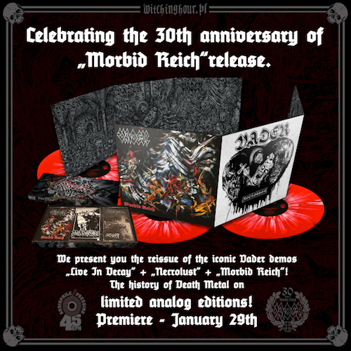 I polacchi Vader celebrano il trentesimo compleanno di “Morbid Reich” con la ristampa dei loro demo attraverso l’etichetta, connazionale, Witching Hour, ovvero “Live in Decay” e “Necrolust”, oltre ovviamente a “Morbid Reich”.