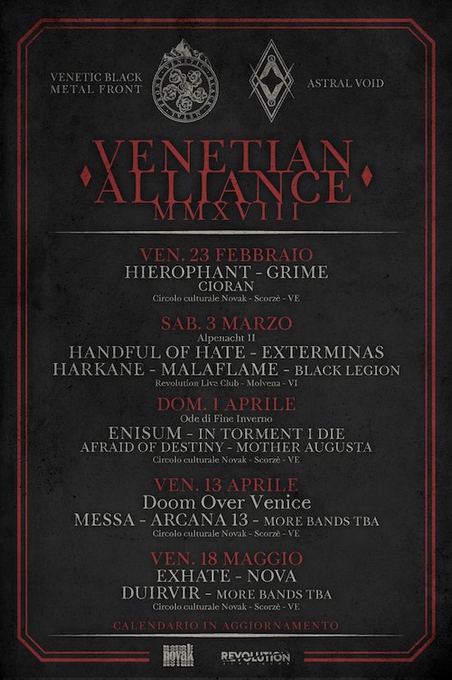 Venetic Black Metal Front e Astral Void uniscono le forze per proporre una serie di serate live dedicate al metal estremo nel Triveneto, affiancando a gruppi locali realtà italiane e straniere. La programmazione inizierà a febbraio 2018 e per il momento si limiterà alle province di Venezia e Vicenza. Il calendario è in costante aggiornamento e ulteriori notizie verranno rese disponibili sul sito web del VBMF, alla pagina Facebook e alla pagina Facebook di Astral Void.