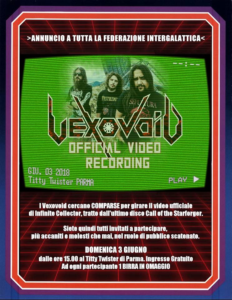 Domenica 3 giugno 2018, presso il Circolo Arci Titty Twister di Parma, si terranno le riprese del videoclip dei thrashers VEXOVOID di “Infinite Collector”, brano tratto dal loro ultimo disco in studio “Call Of The Starforger” edito da Earthquake Terror Noise Records.