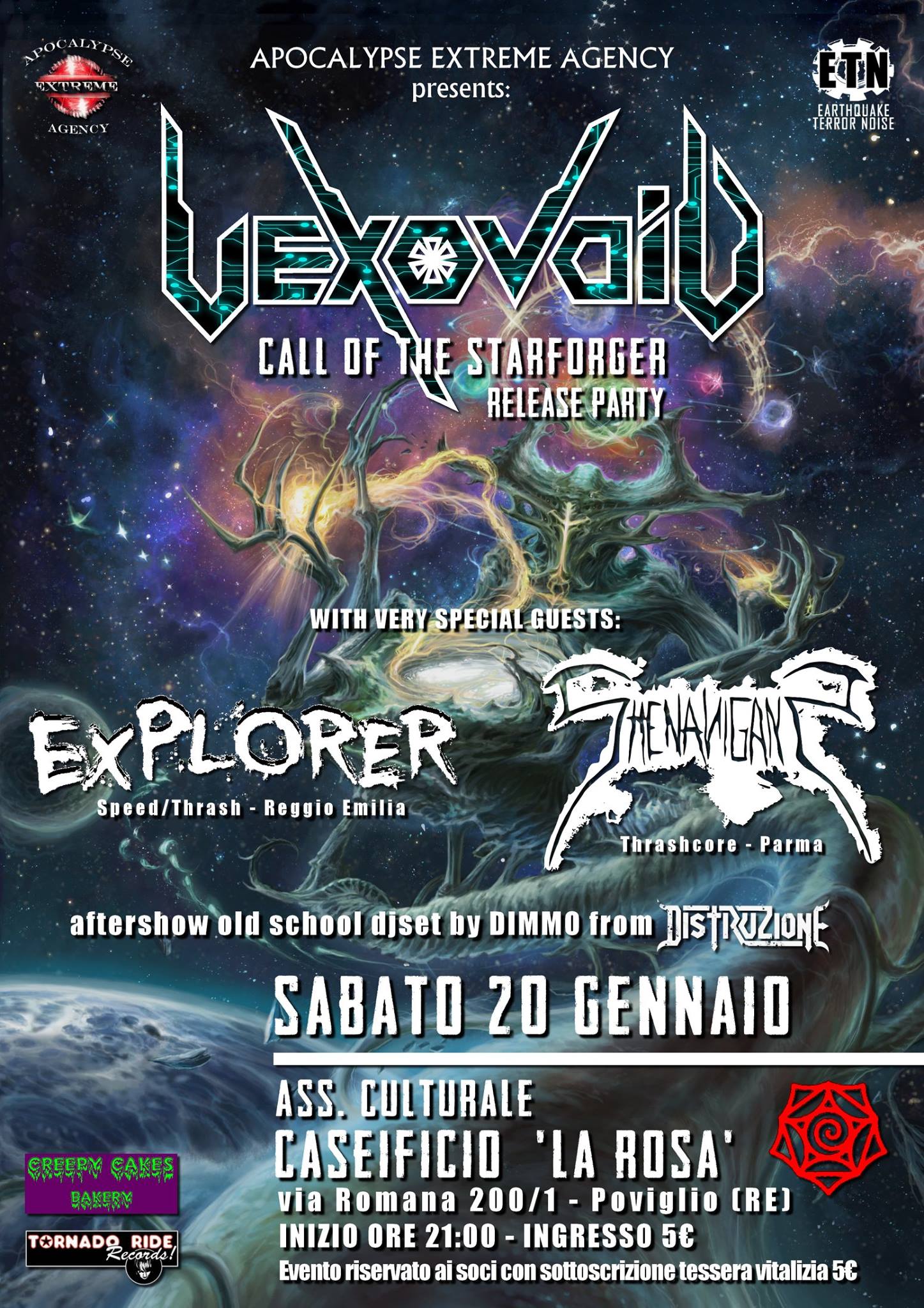 È tutto pronto per il release party del disco d’esordio dei technical/progressive thrashers VEXOVOID dal titolo “CALL OF THE STARFORGER”, che si terrà in esclusiva nazionale presso il Caseificio La Rosa di Poviglio (RE) sabato 20 gennaio 2018.