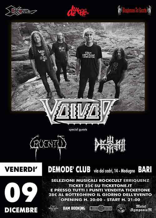 Venerdì 09 dicembre 2022 il grande metal torna in Puglia! Il Demodè Club di Modugno (Bari), in collaborazione con Rockcult e Blasphemous Art Records, ospiterà il primo concerto nel sud Italia dei canadesi Voivod!