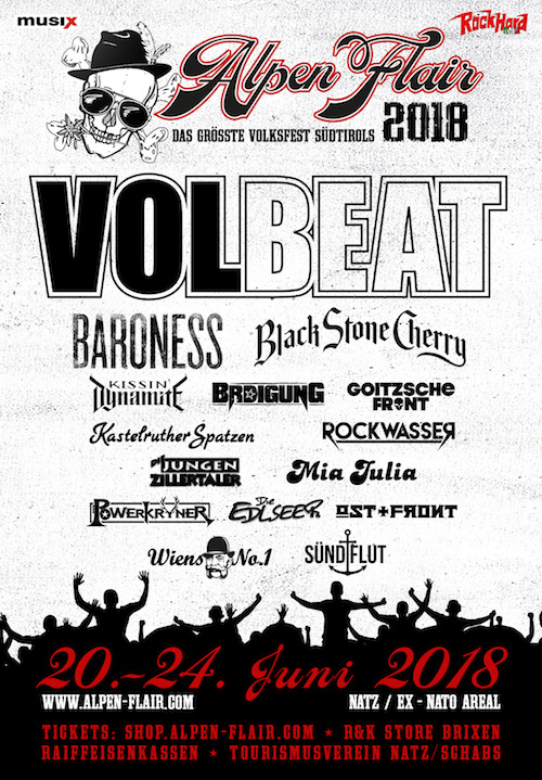 Continuano le conferme dell’Alpen Flair, il festival che si tiene ogni anno a Natz (BZ): dopo l’annuncio dei Black Stone Cherry nella giornata del 23 giugno, oggi i Volbeat confermano la presenza come headliner del 21 giugno, accompagnati dai Baroness e dalle altre band in via di conferma che si alterneranno sul palco durante la giornata.