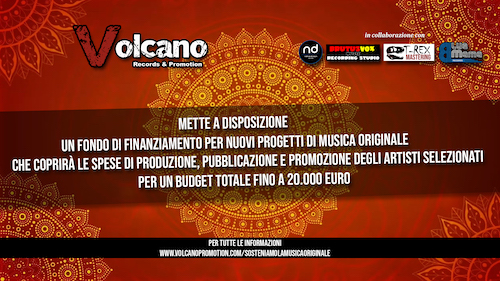 Data la complessa situazione economica che il comparto musica in Italia sta affrontando a causa dell’epidemia di Covid-19, Volcano Records & Promotion in collaborazione con i partner commerciali e strategici Brutus Vox Music Recording Studio, T-Rex Mastering Studio, Native Division Records e Blue Mama Records, ha deciso di mettere a disposizione di artisti, musicisti e band italiane, un fondo per sostenere ed incentivare la produzione di musica originale.