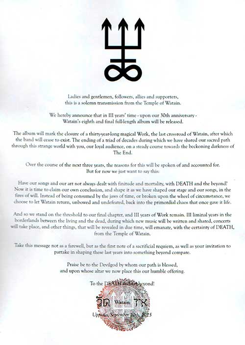 E così siamo sulla soglia del nostro capitolo finale, e ci restano tre anni di lavoro. Tre anni liminali nelle terre di confine tra i vivi e i morti, durante i quali nuova musica sarà scritta e condivisa, si terranno concerti e altre cose, che saranno rivelate a tempo debito, emanaranno, con la certezza della MORTE, dal Tempio di Watain.