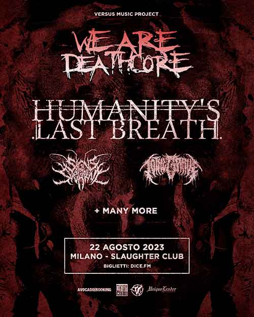 Versus Music Project presenta il We Are Deathcore 2023. Dagli albori nell’era MySpace fino alla gloria mainstream della nuova era, il We Are Deathcore resta un evento di riferimento per la scena estrema dal 2008 e finalmente ritorna dopo gli anni di fermo imposti dalla pandemia. Per la prima volta in Italia arrivano gli Humanity’s Last Breath, accompagnati da Signs Of The Swarm, To The Grave e dal consueto team di opener italiani.