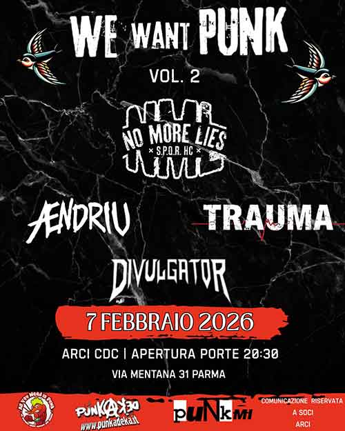 Apriranno Aendriu, chitarrista dei Punkreas, che presenterà il suo progetto solista e le sue nuove canzoni. Poi i Trauma da Pavia, con la loro musica che mescola rabbia e fragilità trasformata in un grido collettivo e i Divulgator da Modena, band hardcore.