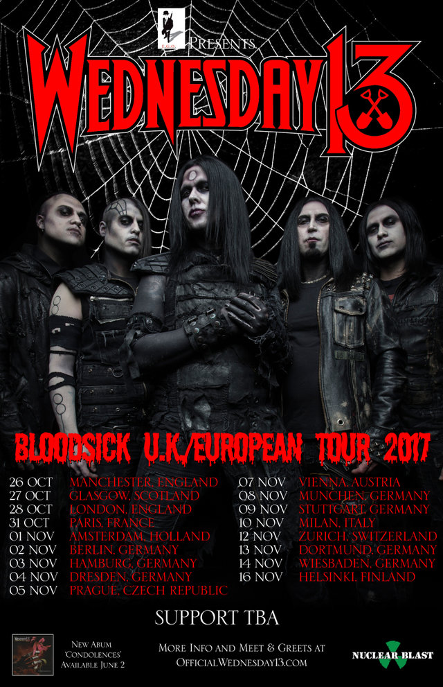 Dopo la pubblicazione del nuovo album “Condolences”, il Duca della Paura WEDNESDAY 13 tornerà sul palco con un tour da headliner nel Regno Unito e in Europa a ottobre e novembre 2017.