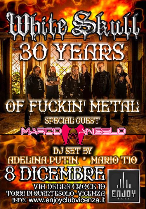 Si svolgerà sabato 8 dicembre, presso l’Enjoy Club di Vicenza, lo show celebrativo per i 30 anni di attività dei WHITE SKULL, band orgoglio dell’heavy metal italiano. Lo spettacolo proporrà una carrellata dei brani più importanti della carriera del Teschio Bianco con ospiti a sorpresa e diversi ex componenti della band. Il compito di cominciare un evento del genere sarà affidato al virtuoso shredder MARCO ANGELO, preceduto dal DjSet di Adelina Putin.