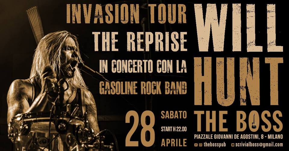 Will Hunt, batterista del gruppo gothic metal statunitense Evanescence (anche con White Noise Owl e per tre anni nella band di Vasco Rossi) torna in Italia ad aprile per un nuovo tour nei club durante il quale, come nel precedente, sarà accompagnato da una serie di rock band del nostro Paese per una scaletta di famose hit internazionali.Al The Boss, in occasione della sua unica tappa meneghina, si esibirà con la Gasoline Rock Band, che nell’occasione presenterà il nuovo batterista Marco Guaita.
