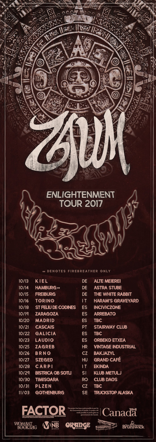 Il prossimo mese i Zaum saranno in Italia. Il duo canadese ha comunicato le date del tour, tra le quali figurano Torino il 16 ottobre e Carpi il 28. Con loro i svedesi Firebreather, dei quali di seguito potete ascoltare il singolo “Emerald Eyes”.