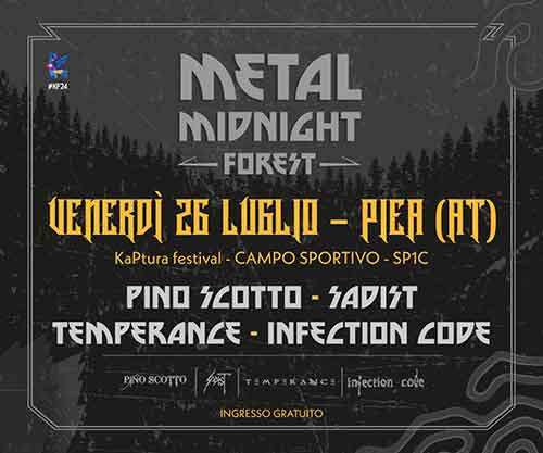 Venerdì 26 luglio al Campo sportivo di Piea in provincia di Asti si terrà il Metal Midnight Forest, la giornata hard’n’heavy all’interno del Kaptura Festival organizzato da Fondazione MOS e Pro Loco Piea. Saranno quattro le band a salire sul prestigioso palco: Pino Scotto, Sadist, Temperance e Infection Code.
